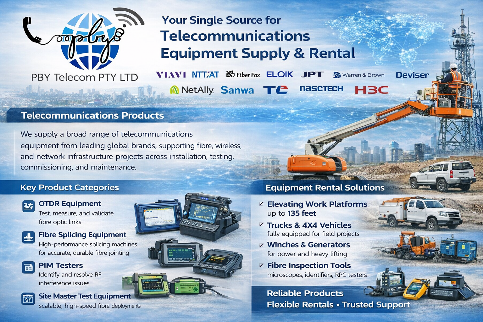 PBY Telecom is your single source for telecommunications equipment supply and rental. We support network builds, upgrades, and maintenance projects with reliable products from trusted manufacturers, along with flexible rental options to suit short term and project based needs.